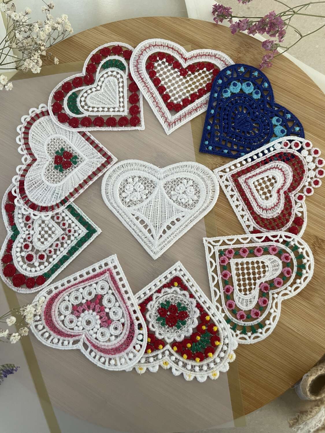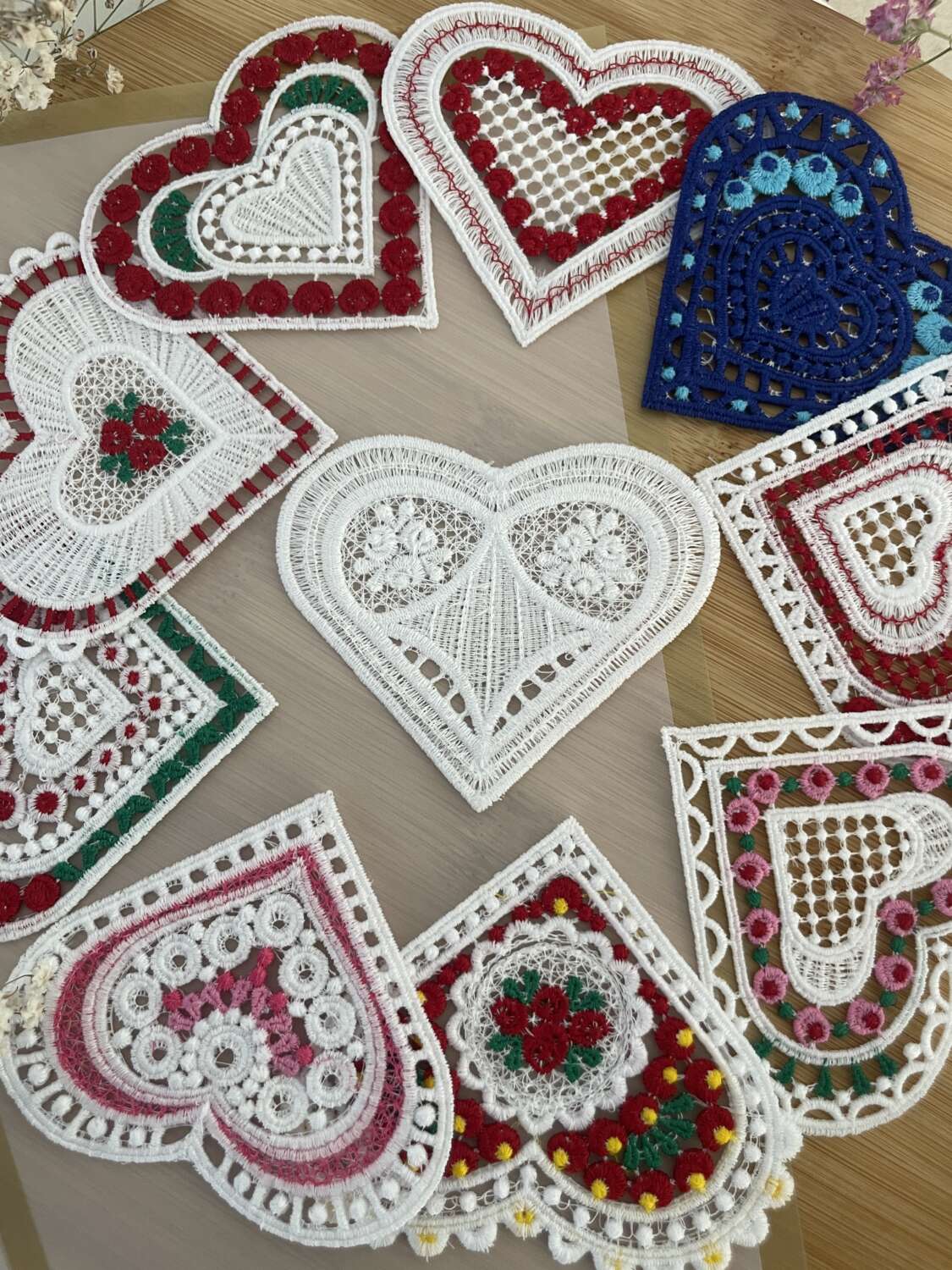 💖 Finoman kidolgozott, keményített csipke szívek – romantikus és sokoldalú dekoráció ✨