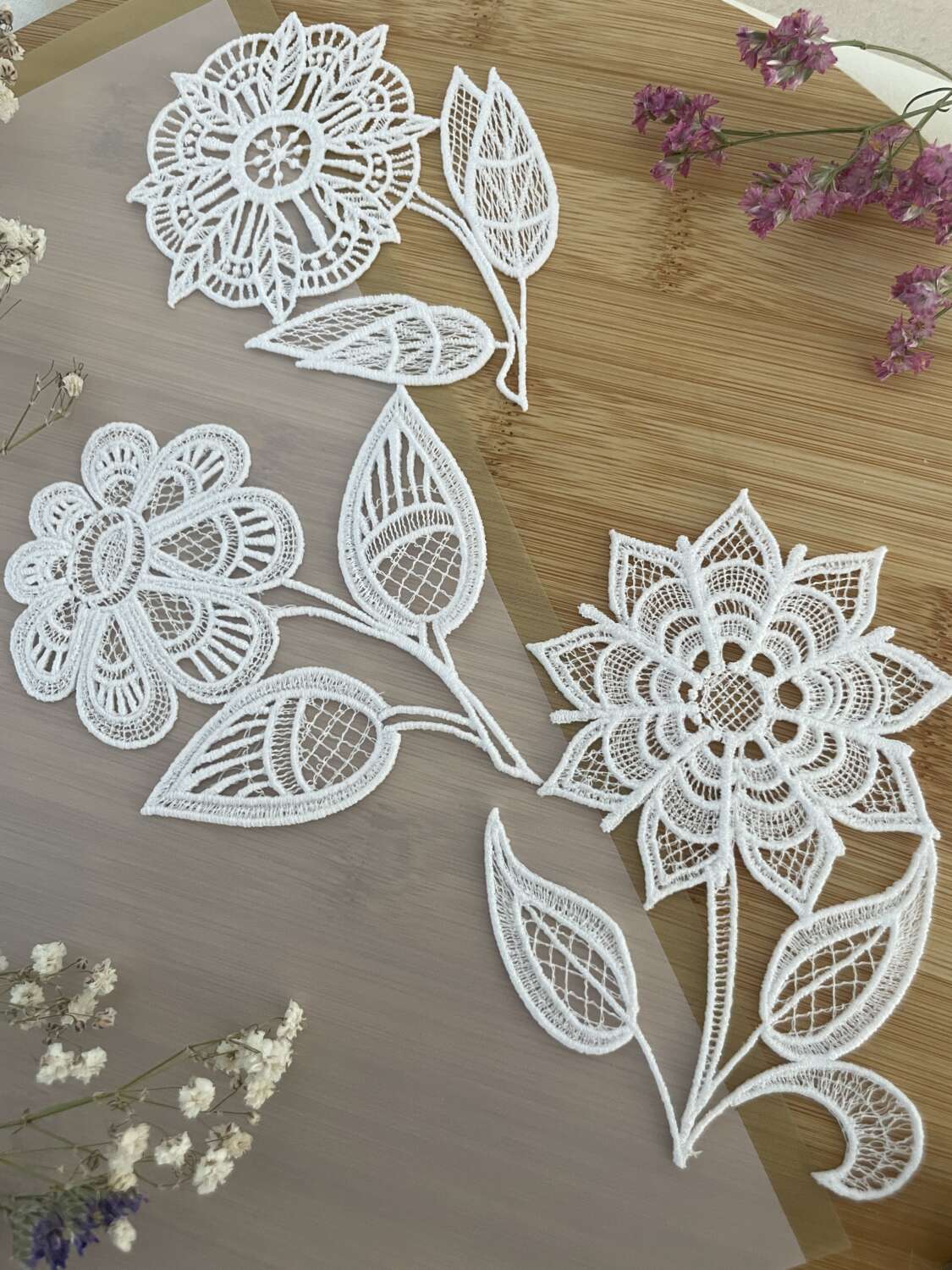 Háromféle, hófehér csipkevirág, finom gépi hímzéssel – hogy bármilyen alkalomhoz eleganciát és kézműves bájt vigyél. Legyen szó ünnepi dekorációról, ajándékcsomag díszítéséről vagy különleges eseményről, ezek a virágok mindig kifinomult választás.