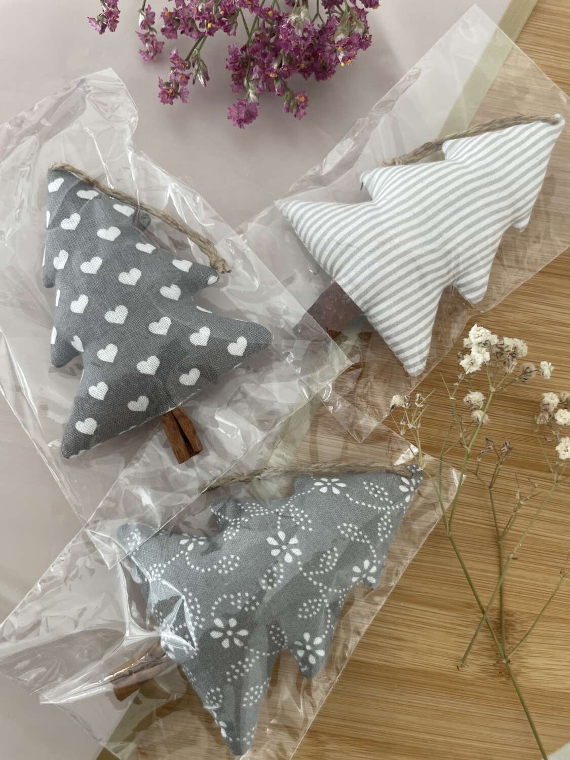 Egyszerű, mégis varázslatos karácsonyi kiegészítő! ✨ Ez a 11 cm-es kézzel készült textil fenyődísz fehér-szürke pamutvászonból készült, puha töltettel. A fahéjrúd törzs természetes hatást kölcsönöz neki, az akasztáshoz pedig natúr zsineg került felhasználásra – így a dísz harmonikusan illeszkedik a skandináv, rusztikus vagy minimalista ünnepi dekorációhoz.