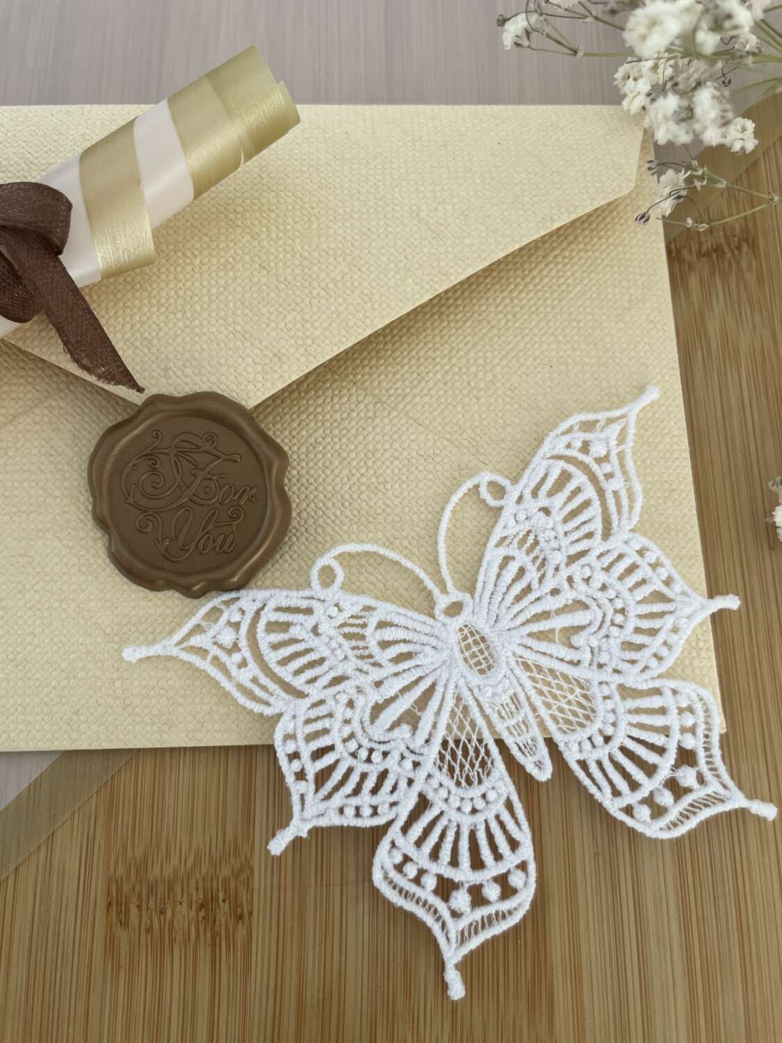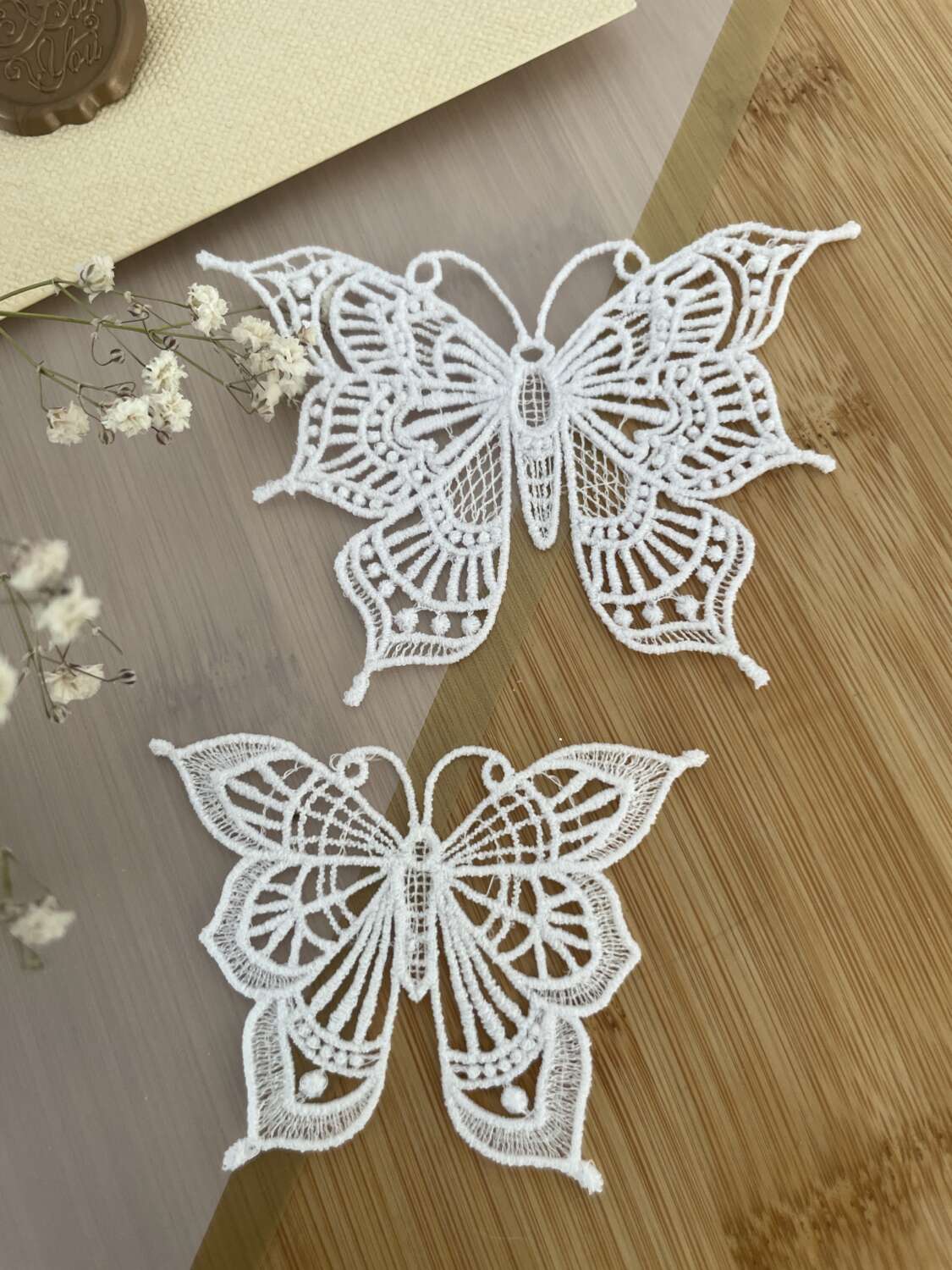 Ezek a hófehér csipke pillangók a szabadság, a könnyedség és a szépség szimbólumai. Két méretben, keményített kivitelben készülnek, hogy bármilyen ünnepi, romantikus vagy otthoni dekorációban időtállóan gyönyörködtethessenek.