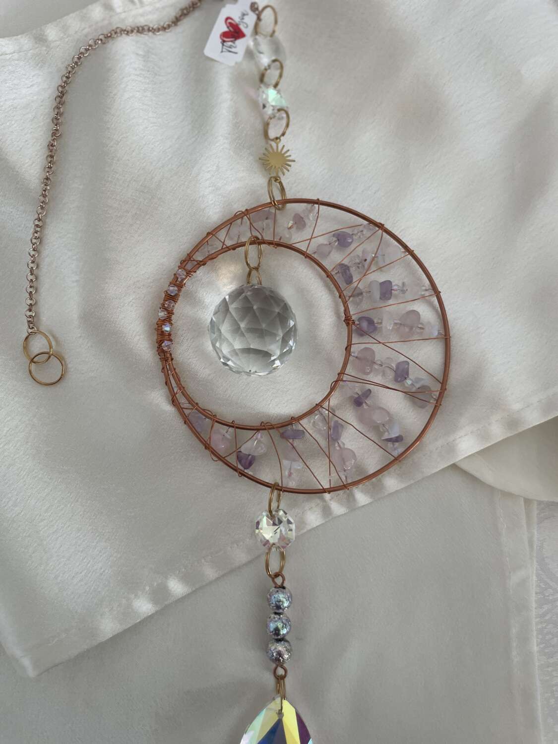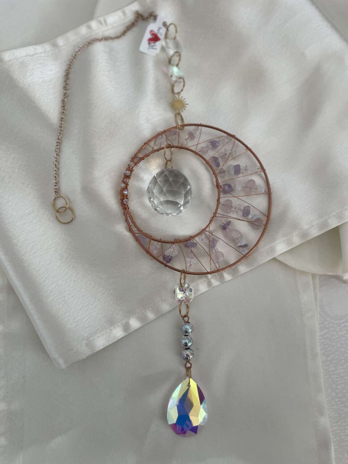 Ez a kézzel készült, excentrikus kialakítású napfogó nem csupán dekoráció, hanem valódi energetikai központ is, amely a fény és a természetes ásványok erejét sugározza a térbe. Különleges formájával és gazdag részleteivel az egyediség és a mély belső harmónia szimbóluma lehet.