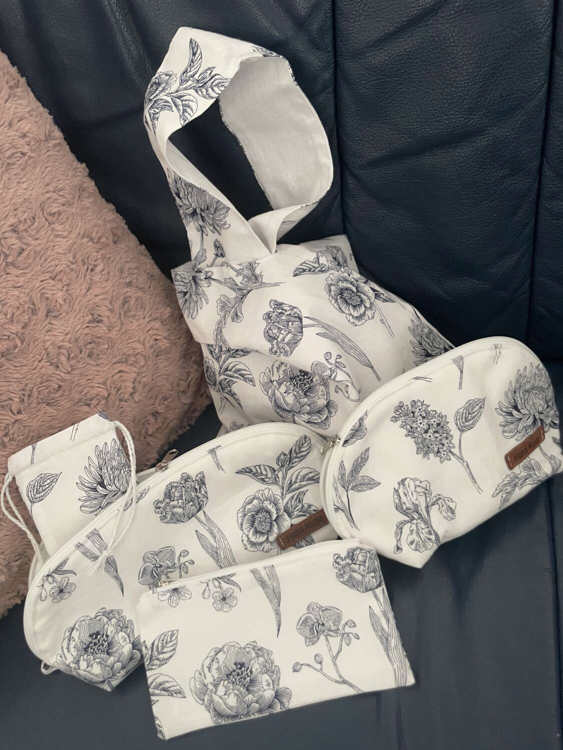 Fehér alapon sötétkék virágmintás pamutvászonból készült, minőségi béléssel, gondos kidolgozással. A szett minden darabja külön-külön is praktikus, együtt pedig egy stílusos és harmonikus összeállítás, amely tökéletes választás a hétköznapokra és ajándéknak is. 🎁✨